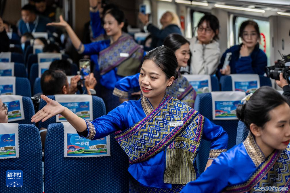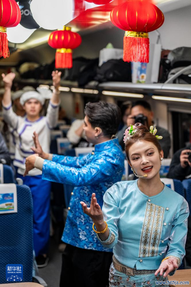 1月14日,中国铁路昆明局“金花列车员”在D87次中老铁路国外游客列车上扮演节目。