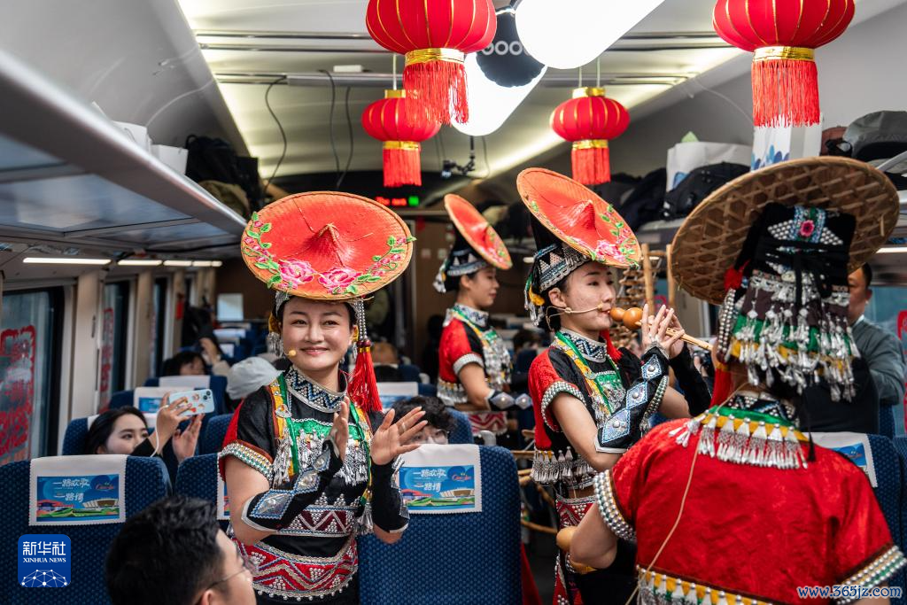 1月14日,玉溪聂耳竹乐团的演员在D87次中老铁路国外游客列车上扮演。