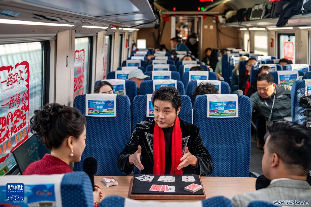 1月14日,魔术师戚原睿(中)在D87次中老铁路国外游客列车上扮演近景魔术。