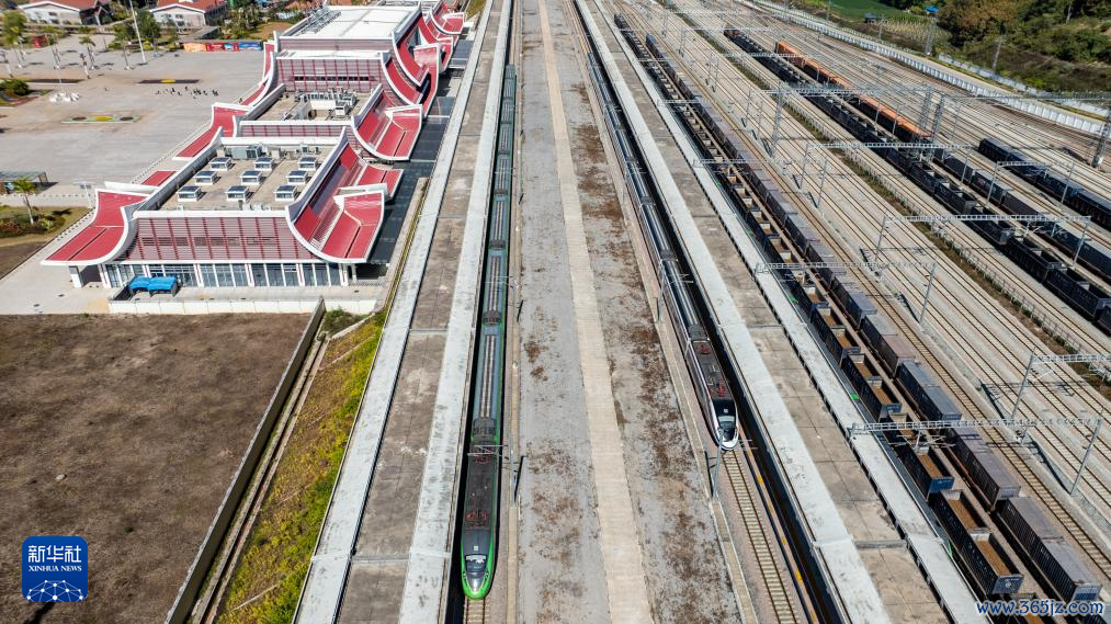 1月14日,D87次中老铁路国外游客列车(左)和“澜沧号”动车组列车停泊在中老铁路磨憨站(无东谈主机像片)。