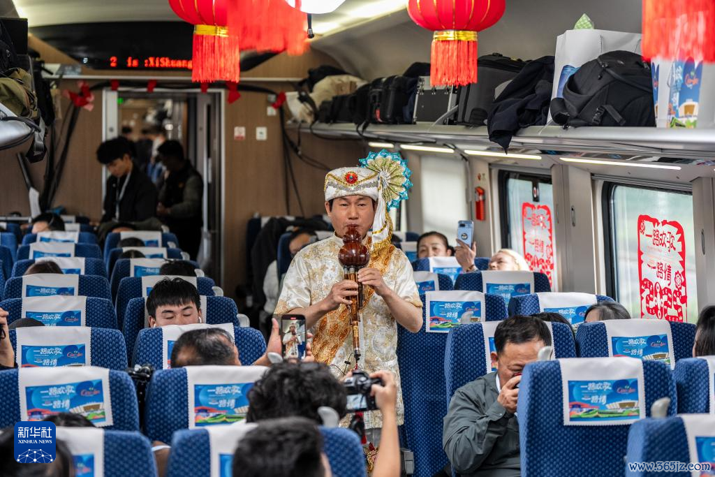1月14日,乐手胡荣坤在D87次中老铁路国外游客列车上演奏葫芦丝。