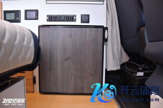 车内左侧浅易厨房区,配有带盖板的洗菜池,弗罗斯特50L房车专用雪柜,上方配有储物吊柜。