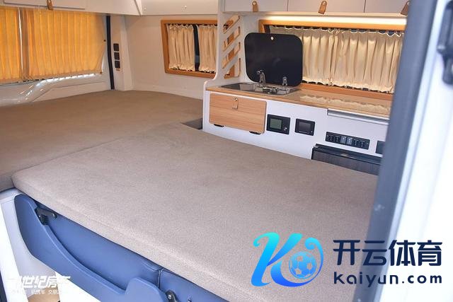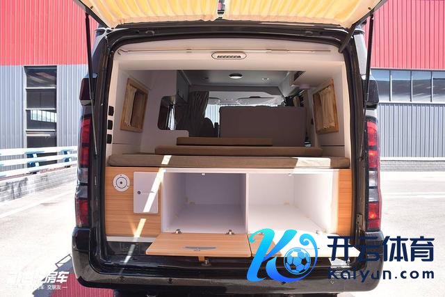 车尾上掀门掀开不错看到两个大容积行李舱,边上配有加水口和户外淋浴喷头。宿营车里面莫得蓄意卫浴空间,如需入厕淋浴则可在车尾搭配淋浴帐篷使用。