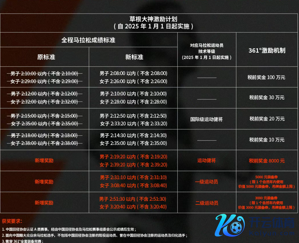 2023年下半年,361°已经发布过一个草根马拉松大神激励机制,其中最高奖金100万元。本年1月开动,361°更新了奖励机制,规则达到须眉2:14:30和女子2:35:00的收成后不错获取10万的奖金。